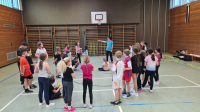 Für die eingeladenen anderen Klassen und Eltern studierte man dann sogar noch einen kleinen Auftritt ein, der mit dem Longrope startete, durch welches alle Schülerinnen und Schüler hintereinander durchlaufen bzw. durchspringen mussten. Schön verteilt in der Halle zeigten dann alle, was sie in den 2 Stunden gelernt haben und beendeten die Vorführung mit einem super Abschlussbild, für welches sich jeder eine tolle Figur mit dem Seil ausgedacht hat.