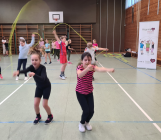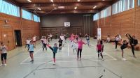 Für die eingeladenen anderen Klassen und Eltern studierte man dann sogar noch einen kleinen Auftritt ein, der mit dem Longrope startete, durch welches alle Schülerinnen und Schüler hintereinander durchlaufen bzw. durchspringen mussten. Schön verteilt in der Halle zeigten dann alle, was sie in den 2 Stunden gelernt haben und beendeten die Vorführung mit einem super Abschlussbild, für welches sich jeder eine tolle Figur mit dem Seil ausgedacht hat.
